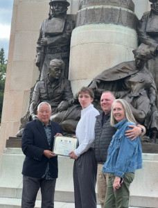 At Fort Lewis, Wash., in front of the 91st Division Monument, MG (R) Rodney Kobayashi (far left) presents Charlie Bergstrom (2nd from the left) with the 2025 91st Division League scholarship check and certificate. Charlie is completing prerequisites at Tacoma Community College and plans to enroll at the University of Washington to complete his BS in pre-med before applying to med school. Charlie is the son of LTC Gregg Bergstrom (3rd from left), a Simulations Officer at 1MCTD, 1BDE, 91TD and Holly Bergstrom (far right).